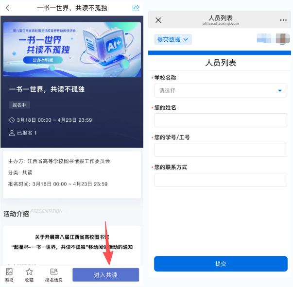 参赛者点击首页右上角,输入邀请码“jjxyyz”进入九江学院图书馆首页,点击首页轮播图“一书一世界·共读不孤独”参与活动。点击“报名参与”,完善相应的个人信息,选择图书进行阅读、撰写读书笔记,参与知识竞答。