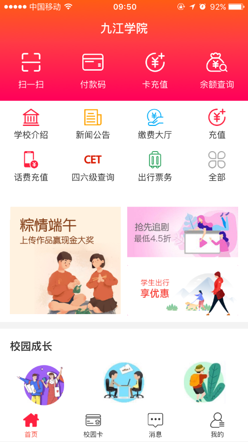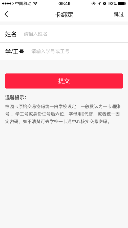 2.登录易校园,进入首页,直接点击右上角的“绑定校园卡”,输入搜索“九江学院”点击确认,然后输入“姓名”“学号或工号”进行校园卡绑定,绑卡成功后可以开始具体的应用使用,如图3,4,5所示。