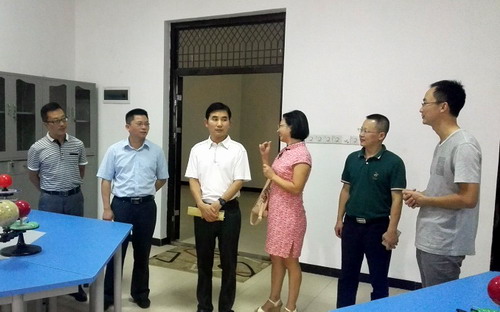 听课前,旅游与国土资源学院院长李松志、党委书记黄伟、副院长孙冬英、张辉陪同魏书记参观了地理综合实验室。魏书记认真参观了地质陈列室、地质与地貌实验室、天文气象实验室、GIS实验室、测量与绘图实验室,了解各个实验室配置、功能和使用情况,魏书记还仔细询问了新建实验室的招标建设情况。
