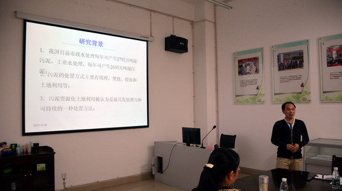 随后,王天峰、杨平华、赵军凯、程鹏飞和邱秀文等五位博士分别作了“基于强化水解和缓解氨抑制的高含固污泥厌氧消化”、“鄱阳湖环境污染物监测”、“长江中下游河湖系统生态安全——河湖关系方面”、 “微藻生物膜贴壁培养及处理废水研究”、“微生物生物淋滤去除污泥中重金属研究”等5个学术报告。
