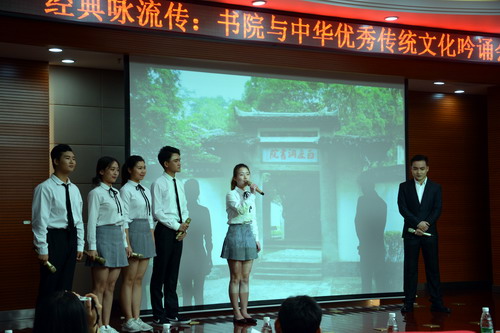 8日下午,两校师生在九江学院逸夫图书馆报告厅共同举行了“经典咏流传:书院与中华优秀传统文化吟诵会”,来自全校各院系近200名师生聆听了吟诵会。吟诵会在“白鹿·嵩阳书院文化之旅十年回顾”影视短片中拉开帷幕,来自两校的大学生通过独唱、独诵、合唱、合诵等形式吟诵歌唱了许多脍炙人口的中华优秀传统文化诗文。郑州大学同学们先后吟诵了《诗经》《楚辞》《行路难》《春江花月夜》《旅夜书怀》《陋室铭》《明月几时有》《岳阳楼记》《沁园春·雪》等名篇,九江学院同学除了带来一组庐山组诗展现庐山文化的丰厚外,还大胆创新,对《琵琶行》《白鹿洞书院揭示》等名篇进行了改编,并吟诵了由九江学院吴国富教授创作的《书院之旅赋》,由九江学院国学班学生创作的《思圣哲》等原创作品。整个节目全部由学生自编自排自演,郑州大学节目更多展现了中原文化的宽广深厚,九江学院的节目则充分表现了南方文化的奇绝瑰秀。两校学生同台演出,共同主持,亲密合作,升华了两校大学生之间的友谊,推动了两校大学生素质教育工作的开展。大家借助诗歌表达了对千年书院的生命礼赞,抒发了对传统文化的热爱之情,展现了青年学子传承发展中华优秀传统文化的决心和担当!吟诵会最后在《嵩阳,白鹿,为了与你的相遇》中结束,大家相约明年再会!