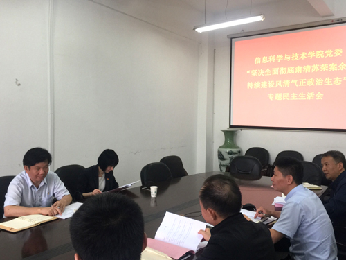 9月27日下午,信息科学与技术学院党委在文友楼514会议室召开“坚决全面彻底肃清苏荣案余毒,持续建设风清气正政治生态”专题民主生活会。校党委委员、副校长王万山同志,党校常务副校长、组织人事部副部长李苏琴同志及信息科学与技术学院党委班子成员参加了会议,会议由学院党委书记袁宜如同志主持。