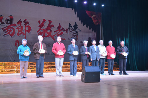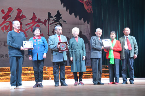 魏立平副书记为到现场的学校首届“最美老同志”王坚强、吕珍儒、李萍、欧阳祖照、周绍云、程平孙、舒晓山颁发了荣誉盘,并合影留念。