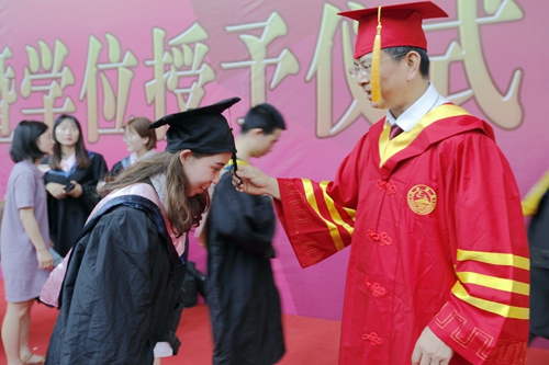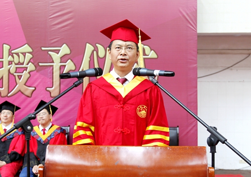 在学位授予仪式上,校党委书记赵伟、校长刘晓东为毕业生代表颁发毕业证书,全体校领导为毕业生代表拨正流苏,祝愿他们前程似锦、展翅高飞。