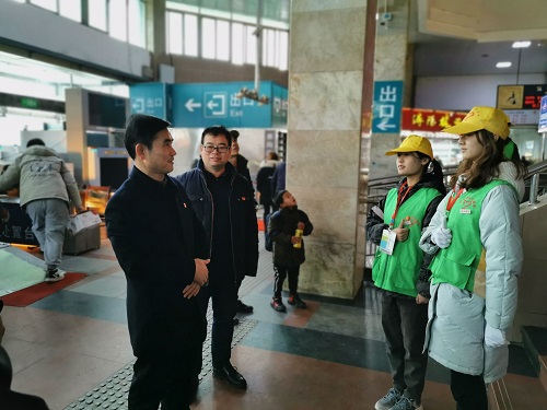 魏立平听取了九江车务段负责同志对暖冬行动情况的介绍,并来到售票厅、进站口、咨询台、候车室等志愿者服务区域,与我校春运志愿者亲切交谈,全面详细了解志愿者在售票指引、安检引导、旅客疏导等志愿服务岗位上的工作情况。魏立平亲切问候我校大学生志愿者,向他们致以新春祝福,赞扬他们放弃假期发扬奉献、友爱、互助、进步的志愿者精神助力春运,为旅客出行提供细致入微的温暖服务,也为九院学子赢得良好社会声誉。他希望志愿者们弘扬九江学院服务社会的优良传统,展示时代新人形象,树立九江文明标杆,在服务旅客过程中受教育、长才干、作贡献。他还叮嘱同学们在确保服务质量的同时注意安全,要求校团委加强和有关部门的协作,不断健全志愿者工作保障机制,保障“暖冬行动”青年志愿者有序、平安、快乐地参与志愿服务。