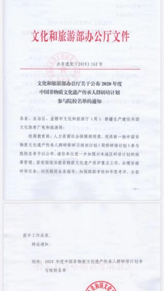 我校被文化和旅游部列为“2020年度中国非物质文化遗产传承人群研培计划参与院校”