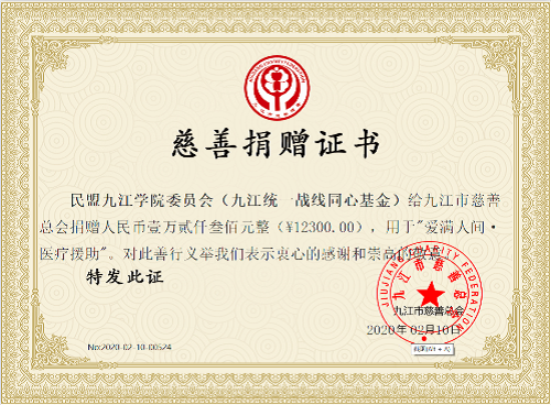 本次捐赠活动既是对中共九江市委统战部《致全市统战干部和统一战线成员的倡议书》和《致全市统一战线各界人士的倡议书》积极响应,也体现了作为参政党一员的民盟九江学院委员会盟员同志们众志成城共克时难的一种担当。我们坚信,有中国特色社会主义的制度优势,有党中央的坚强领导,有各级党委政府的紧密部署和科学调度,有各界群众的同心同行、众志成城,我们必将战胜新型冠状病毒肺炎,我们也一定能够打赢这场疫情防控的人民战争、总体战、阻击战!
