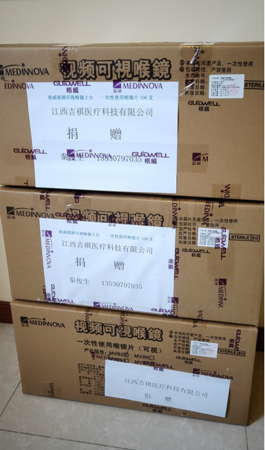 1月29日,2位校友——江西吉祺医疗科技有限公司和深圳市鹏一生物技术有限公司董事长柯长文及公司创办合伙人秦俊生获悉捐赠公告,得知附属医院紧缺医疗物资中包含可视喉镜及叶片设备,柯长文、秦俊生简单商量后立即决定向母校捐赠医疗物资和设备,随即与九江学院校友办沟通联系,并由秦俊生具体负责设备捐赠事宜。经九江学院校友办的牵线搭桥,与我校附属医院负责捐赠事宜的钟老师沟通后,他们千方百计,紧急联系在深圳相关朋友和医疗机构,以江西吉祺医疗科技有限公司的名义购买并向九江学院附属医院捐赠视频可视喉镜2台及喉片100片,市场总价值12余万元。
