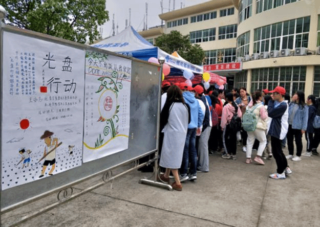 九江学院各二级学院也连续多年投入到“光盘行动”中,积极主动组织“光盘”倡导活动。学生志愿者们齐聚三食堂广场共同举办“光盘行动从我做起”海报展览宣传活动;围绕“提倡节约,反对浪费”主题,以饭碗、勺子、刀叉等日常饮食经常接触到的食具为主体进行LOGO创作;学生志愿者在各个食堂门口、用餐区以及收餐区进行引导,以语言提示、“光盘监督”、卡通互动等形式传递勤俭节约信息;在食堂的倒餐处,有学生志愿者为“光盘”的同学送上活动卡片,得到卡片的同学们都将有机会参与抽奖活动赢取奖品;举办“光盘行动”挑战赛,活动期间,同学们吃完饭之后将“光盘”图片发到微博上打卡,并呼吁更多人参与进来......