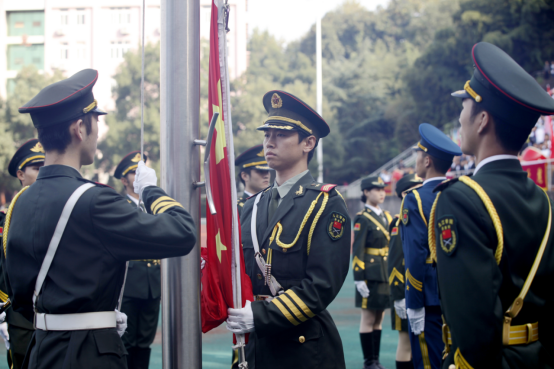 入场式结束后,国旗班的同学们迈着矫健整齐的步伐走向升旗台,在庄严的国歌声中,在全体师生的注目礼下,五星红旗冉冉升起,飘扬在学校的上空。