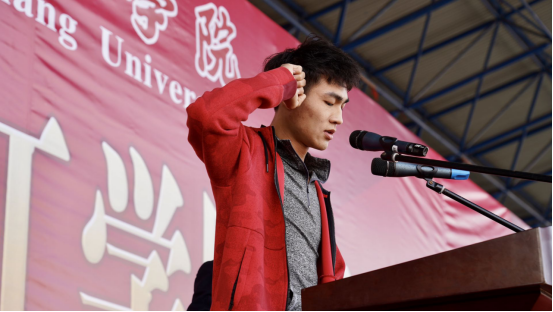 体育学院2019级学生张聪同学代表全体运动员、体育学院曹钧老师代表全体裁判员向大会进行庄严宣誓。