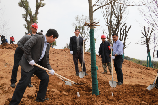 上午10点,植树队伍积极投入到植树活动中,大家纷纷拿起铁锹、铲土入坑、培实新土,将一棵棵枫香树和樟树种下,活动现场一派热火朝天的景象。大家一边劳动,一边欣赏和谈论新校区的美景和建设情况,脸上绽放出幸福的笑容。一会工夫,八里坡上树木迎风挺立,在阳光的照射下生机勃勃。