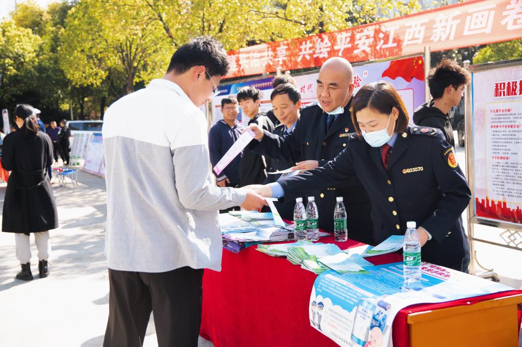 活动以“共建共治共享,共绘平安江西新画卷”为主题,展出了40余块主题宣传展板,内容包括“习近平总书记关于平安建设的重要指示”“中央和省委省政府关于平安建设的决策部署”“抗击新冠肺炎疫情有关法规和先进事迹”“预防黄赌毒”、“预防电信网络诈骗和网络借贷”“反邪教”“反恐”“反传销”、“心理健康教育”“矛盾纠纷排查调处”“应急救护”“危化品安全”“饮食安全”“交通安全”和“消防安全”等。各参会的驻地相关单位向参加活动的师生发放了宣传资料,并现场向师生们讲解了相关法规政策和安全常识。