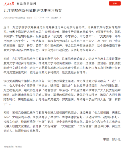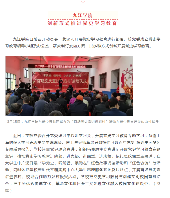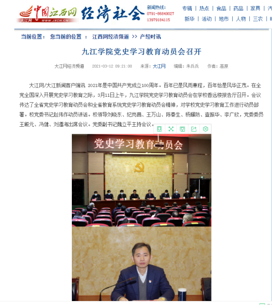 近日以来,学校党史学习教育受到中央及省市主要媒体广泛关注。截至目前,学习强国、人民日报客户端、新华社客户端、中国新闻网、江西省委党史教育专题网站、江西教育电视台、中国江西网、江西日报、江西教育网、九江广播电视台等媒体40余篇稿件报道了我校党史学习教育,引发校内外热烈反响,为党史学习教育的深入开展营造了良好的舆论氛围。