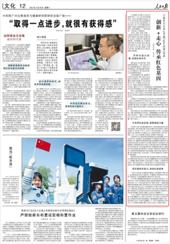 学校创新宣传方式,线上线下、校内校外联动,营造浓厚学习氛围。建设党史学习教育专题网站,全媒体开设专题专栏,构建“报、网、端、微、屏”等全媒体传播矩阵,及时传递党史学习理论、动态、经验等。截至4月底,学校已编发10期党史学习教育简报;开设党史学习教育专栏,讲述党史革命先辈故事。各二级党委积极组织师生参加由江西省委宣传部组织开展的“四史”学习教育知识竞赛,各二级党组织及时宣传推介党史学习教育进展情况、经验做法,形成党史学习教育热潮。
