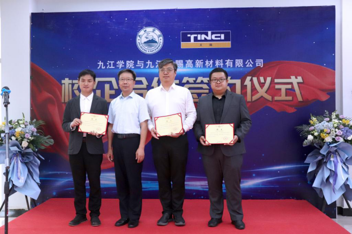 5月26日,我校化学化工学院、资源环境学院与九江天赐高新材料有限公司“订单班”签约和教育实训基地揭牌仪式在九江湖口县新材料协同创新中心举行。市政协副主席、化学化工学院院长严平,资源环境学院负责人,九江天赐高新材料有限公司法人兼执行董事长赵经纬博士、人力资源总监黄娜等出席签约和揭牌仪式。