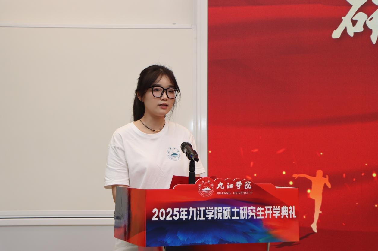 典礼上,李明斌首先向来自全国23 个省份、50 多所高校的新研究生表示欢迎,强调多元化的生源背景将为校园注入新的活力。在回顾学校办学历史时,李明斌指出,九江学院溯源于1901年创立的但福德医院护士学校,2002年由四校合并升格为本科高校,2024年成功获批硕士学位授予单位,生物与医药、资源与环境、国际商务三个学位点成为首批硕士授权专业。目前,学校正紧紧围绕更名大学的目标强化学科建设,已有10个学位点达到申硕条件,研究生教育体系日益完善。他还特别介绍了学校在科研与社会服务方面取得的显著成绩,包括荣获3项国家级行业科技奖、2024年以来科研与社会服务到账经费突破1亿元,并拥有重组后的省级重点实验室和10个国家级科技小院等高层次平台,为研究生学术研究与实战能力提升提供了坚实支撑。