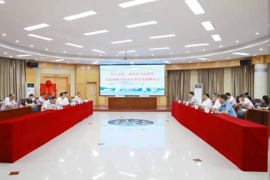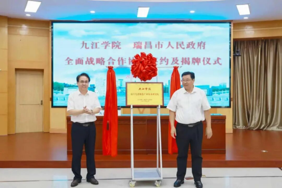 9月12日上午,九江学院与瑞昌市人民政府全面战略合作协议签约仪式在学校举行。九江学院党委书记李明斌、瑞昌市委书记卢治轩出席仪式,并共同为九江学院瑞昌先进制造产业技术研究院揭牌。九江学院党委委员、副校长查振华主持仪式,九江学院党委委员、副校长王殿元,党委委员、组织部部长杨杰,瑞昌市委常委、组织部部长危建武,市委常委、副市长高阔,瑞昌核研院常务副院长黄青华出席仪式。