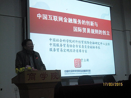 讲座中,于立新研究员从互联网金融概念、模式及发展现状入题,利用大量的数据和经典案例,从当前新的经济发展形势下互联网金融的创新发展趋势、正负面影响、发展互联网金融、创立互联网金融服务贸易规则的意义和具体路径,以及欧美发达经济体互联网金融监管经验等六个方面娓娓道来、系统展开,既给在场听众讲授了互联网金融发展的相关理论和实践经验,又详细介绍了刚刚结束的“两会”中关于鼓励互联网金融发展的相关政策和措施,还就这种新业态的发展趋势下,同学们应当如何储备知识、更新知识,为将来更好就业打下坚实基础提出了建议。整个讲座内容详实、思路清晰、观点鲜明,给所有在场学生感到获益良多。