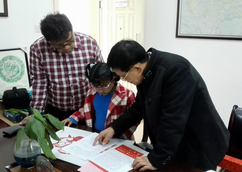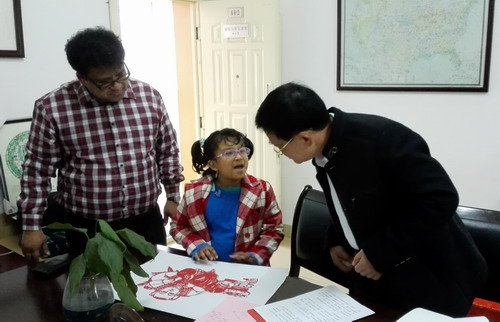 3月18日下午,在校行政楼402办公室,热烈上演着我校外籍教师Raza的女儿Isna拜师学艺的一幕。九江市外专局副局长詹冬龙专门陪同瑞昌剪纸大师朱扑光教授前来九江学院参加收徒仪式。参加仪式的还有国际处的王贤淼副处长、吴滔主任以及外籍教师Raza一家。