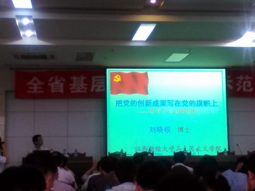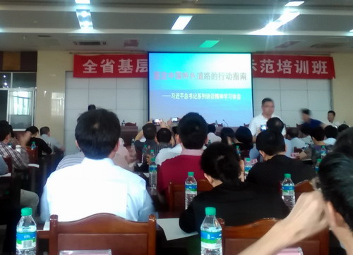 5月30日下午2:30,培训班举行开班仪式,江西经济管理干部学院院长秦夏明致辞;省委党建工作领导小组办公室副主任王家龙同志讲话,他强调举办基层党组织书记省级示范培训班的重大意义,希望大家珍惜学习机会,真正学有所获、学有所成,并要求严肃培训纪律,加强交流,认真参加好各项培训工作。随后,省委党校高继民教授作题为《坚定中国特色道路的行动指南——习近平总书记系列重要讲话精神学习体会》的讲座。江西财经大学刘晓根博士作题为《把党的创新成果写在党的旗帜上——学习十八大新党章》的讲座。