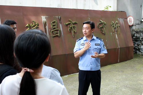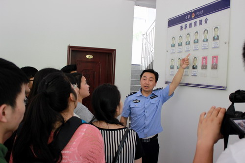 看守所见习教学结束后,程教导员带领同学们来到瑞昌市公安局警员训练宣教基地见习教学。程教导员首先向同学们介绍了部分优秀公安干警的先进事迹,并就全国优秀公安民警、全国五一劳动模范、瑞昌市肇城派出所教导员周俊军的先进感人事迹做了重点介绍,一线公安干警们的正能量使同学们听后备受鼓舞,对在辛勤工作在公安一线的公安干警多了一份认同、理解与敬佩。
