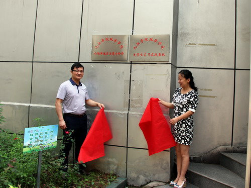 签约仪式后,政法学院副院长曹钟安、九江市妇联副主席江浔共同为 “九江学院政法学院大学生实习实践基地”、“九江学向阳闸社区法律分诊所”及“向阳闸社区妇女儿童维权之家”进行揭牌。揭牌仪式后,全体人员参观了向阳闸社区居民服务中心并举行了三方座谈,并就具体的合作事宜及下一步的合作项目等内容作了详细沟通交流。