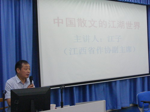 应文传学院邀请,6月18日下午,江西省作协副主席江子来到文友楼205,为文传学院汉语言文学专业师生和浪井文学社成员带来了一场精彩的学术报告——“中国散文的江湖世界”。报告会由文传学院副院长江腊生主持。