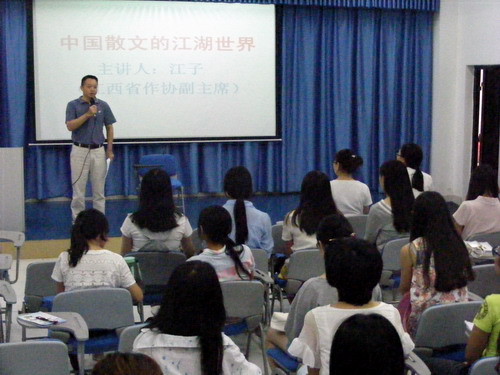 江子先生从中国散文说起,从古代到现代,列举了王小妮、祝勇、马莉、庞培、周晓峰、南帆等一批有影响的作家,又谈到江西本土的散文作家,比如王小莉、范小波、傅菲、陈蔚文、夏磊、安男、李小军、朱强,概括出江西散文呈现的整体特点,即主要围绕乡土、历史和少年的成长展开,温润、谦和、诗性,与自然有天然的亲和力,对天地万物具有悲悯之心。最后回到自己的散文创作,介绍了他的散文创作《田园将芜》、《苍山如海:井冈山往事》等,并提出了好散文的标准:有独立思想,有独特发现,有艺术品质。给在座的大学生提出了学习创作的建议:变高中时的“作文化”为“作品化”,要有文体感,大量阅读,提高文学修养;提高个人修养。