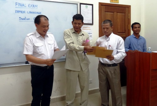 柬埔寨王家研究院国家语言委员会秘书长萨皮阁下(H.E. SAN PEOU)与柬埔寨王家研究院孔子学院中方院长帅式毅共同开启本次考试,孔子学院的9名汉语志愿者老师参加了考试。