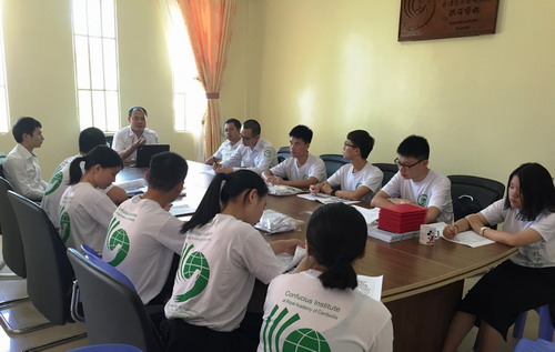 10月1日,柬埔寨王家研究院孔子学院在孔子学院大楼会议室进行第二批新任汉语教师志愿者岗前培训,参加培训的是即将赴任棉芷大学中文系、西港高中汉语中心、大岛洪森中学汉语中心、柬埔寨国际大学(马德望)的9名志愿者。孔子学院中方院长帅式毅主持本次培训活动,国家汉办柬埔寨汉语教师志愿者管理教师赵玉玺、棉芷大学中文系与西港高中汉语中心两位教师负责人参加了岗前培训活动。