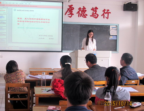 10月14日下午,化学与环境工程学院2012级本科毕业论文(设计)开题报告会在向学楼举行,分六个组在不同的多媒体教室进行,每位同学都准备了PPT汇报,30余名评审教师及2012级所有本科生参加了开题报告会。