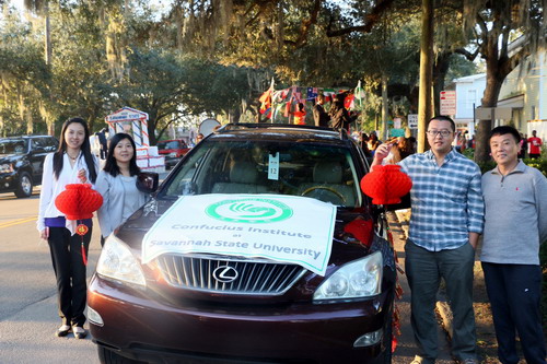 孔子学院教师们为这次游行做了充分的准备,在孔子学院游行花车的前面最醒目处布置了萨凡纳州立大学孔子学院的徽标,同时,为了向社区民众展示中华文化的魅力,老师们在车前方两侧挂上了大红灯笼,在车的尾部两侧挂上了鞭炮装饰品,使得孔子学院的花车在游行队伍里面非常引人注目,中国元素的点缀将整个游行队伍的气氛烘托得更加喜庆祥和。在游行活动中不时有当地民众用中文“你好!”向孔子学院教师们打招呼。