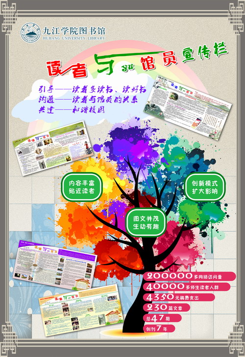 首届全国高校图书馆阅读推广案例大赛于2014年10月启动,今年上半年,全国六个分赛区及港澳台地区组织开展了分赛区的初赛工作,共有456个案例参赛。其中,有38个案例参加决赛,并与118个优秀案例(含单项奖案例)参加决赛现场的海报展示。我馆推送的“《读者与馆员》宣传栏”从华中赛区脱颖而出,荣获大赛优秀奖并参加了决赛现场的海报展示。