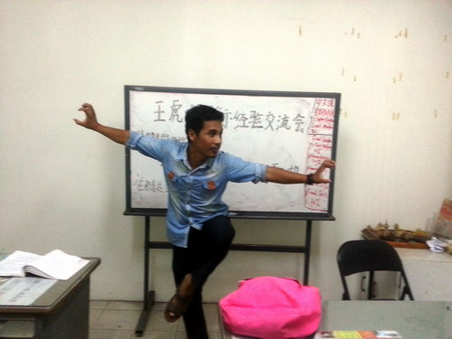 12月13日,柬埔寨王家研究院孔子学院金边华商文化中心汉语中心按预定的工作计划继续开展“每周中国文化活动”,本周邀请到了孔子学院优秀学员王虎(Keath Piseth),作为2015世界大学生“汉语桥”柬埔寨赛区亚军得主暨第十四届“汉语桥”世界大学生中文比赛观摩夏令营营员、2015柬埔寨中文歌曲大赛冠军得主,他十分热情地向学员们展示了各项他擅长的中华才艺,并分享了“汉语桥”比赛、参加HSK考试和三次赴华体验学习的心得体会。