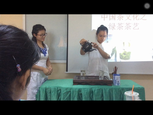 九江学院选派的汉语教师志愿者符素梅通过询问学生已学的“你家在哪儿?”“我家在江西九江。”等地点名词,借助PPT层层递进向同学们展示了“中国”“江西”“九江”“九江学院”“庐山”等。紧接着,符素梅讲到了庐山云雾茶,并向学生们展示了实物和图片。随后,又逐一介绍了庐山云雾茶和茶具。接下来,在悠扬清新脱俗的古筝版纯音乐《高山流水》的音乐背景下展示了中国绿茶茶艺。