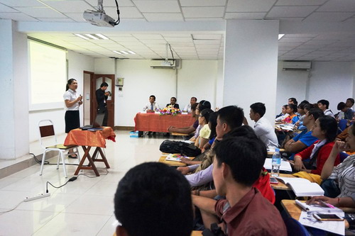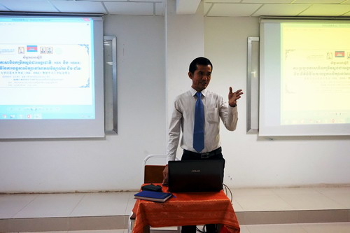 帅式毅院长简要介绍了孔子学院中方承办院校九江学院的情况,九江学院处在中国华东地区连接中西部的枢纽城市九江,历来是兵家必争、人杰地灵之地。他指出,2013年,九江学院和亚欧大学签署了合作协议,每年会为亚欧大学提供10个奖学金名额,2015年,首批7名学生赴九江学院学习,目前该批学生在九江学院学习顺利。九江学院还将为亚欧大学学生提供江西省政府奖学金、九江学院奖学金,学生通过HSK5级以后,可以选择插班和中国学生同堂进行专业学习。作为九江学院现任的国际合作交流处处长,他表示欢迎亚欧大学学生申请奖学金或自费到九江学院学习。孔子学院为中柬友好交流搭建了一座座桥梁,2015年5月,中国江西省政府在《参与丝绸之路经济带和21世纪海上丝绸之路建设工作要点》中,把“继续加强九江学院合作建设柬埔寨王家研究院孔子学院”作为优先推进项目。随着“一带一路”项目建设的全面铺开,为柬埔寨学生就业、赴中国留学带来了新机遇; “一带一路”建设过程中将需要大量的懂中文、有专业的本土人才。