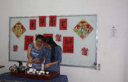 在介绍完了茶文化之后钟丹丹还向在座的学生们介绍了中华茶艺文化的由来和发展,并向学生展示了中华茶艺所需的茶具及茶艺的具体流程。此次中华茶艺展示以瓷制的盖碗茶艺为主,在表演的过程中详细地向学生解释了在泡茶过程中需要注意的一些茶礼和动作要领。在流程讲解结束后还邀请了学生上台进行茶艺体验,让学生在体验中领悟中华茶艺之美。