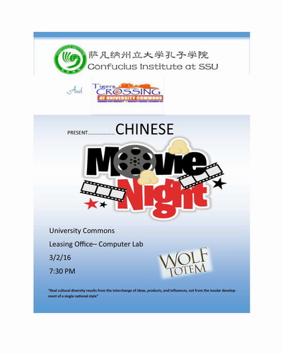 为了更好地帮助美国萨凡纳市居民了解中国文化和当代中国电影艺术,萨凡纳州立大学孔子学院和萨凡纳州立大学学生活动中心共同举办“中国优秀电影展”活动。计划在每个月的第一个星期三为萨凡纳州立大学师生和当地社区居民播放一部中国优秀电影。美国当地时间3月3日,萨凡纳州立大学孔子学院在州立大学学生公寓活动中心举办“中国优秀电影展”首场活动。