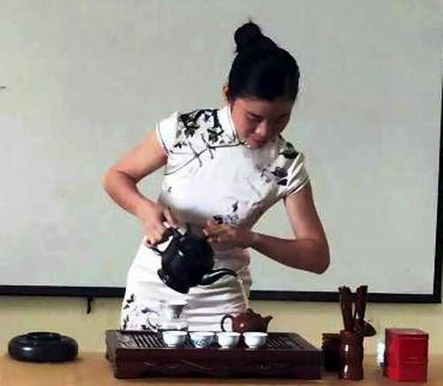 看完精彩的表演后,大家一起品尝了陈慧玲泡好的茶。最后毛万老师在陈慧玲的指导下亲自体验了茶艺表演的整个过程。