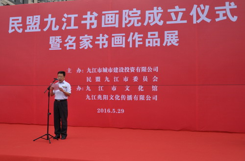 5月29日上午,民盟九江书画院成立暨九江市著名书画家作品展览在九江市水岸莲华销售中心举行,市政协副主席陶春元,市政协副主席、统战部长黄大明,市政协副主席李军,市委宣传部副部长、精神文明办主任刘明华,市委统战部副部长蔡卫宁,民盟江西省委专职副主委任江南,民盟抚州市主委章克敏,民盟九江市主委严平等领导出席开幕仪式。民盟九江学院委员会主委梅龙宝带领30余名盟员参加成立仪式。