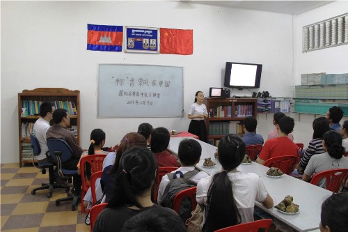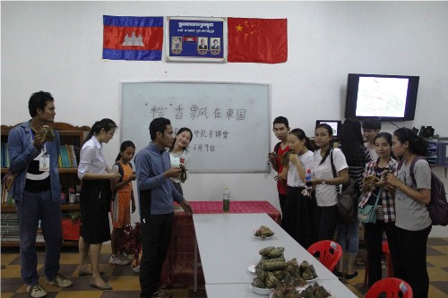 讲座后,大家一起品尝各种风味的粽子,边品尝边讨论端午节的各种文化活动,学生们都觉得这些文化活动有很深的底蕴,值得传承和发扬。学生赵雨说:“我要好好学汉语,了解更多的中国文化。从而让柬埔寨更加了解中国,也让中国人更加了解柬埔寨。为中柬两国的交往贡献一份微薄的力量。”他的话道出了很多学生的心声。“粽”香飘在柬国,把两国人民的心紧紧包围起来,越靠越近。(杨芬芬)