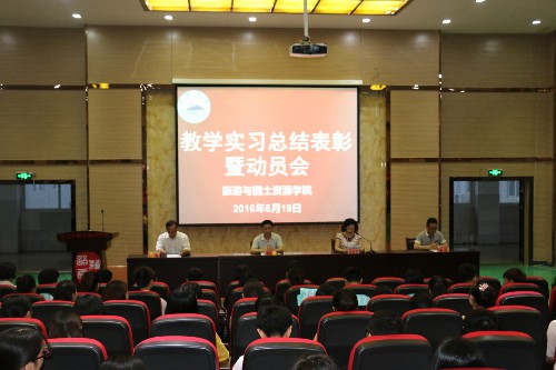 6月19日晚,旅游与国土资源学院在香远楼三楼报告厅,隆重召开教学实习总结表彰暨动员大会,院长李松志,副院长孙冬英、赵追、张辉出席会议,办公室、教务科、学生科、团委、全体班主任及实习带队老师,全体教学实习生共计400余人参加了此次大会。会议由孙冬英副院长主持。