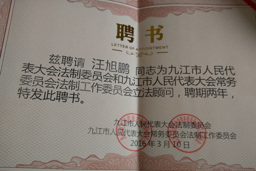 为了建立健全科学立法、民主立法机制,提高立法工作质量和效率,推进立法决策的民主化、科学化。2016年3月10日,九江市人大常委会举行了全市立法工作座谈会,政法学院贺思源博士、汪旭鹏博士被九江市人民代表大会法制委员会和九江市人民代表大会常务委员会法制工作委员会聘为立法顾问。