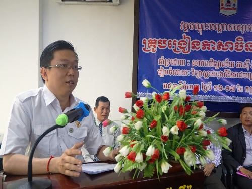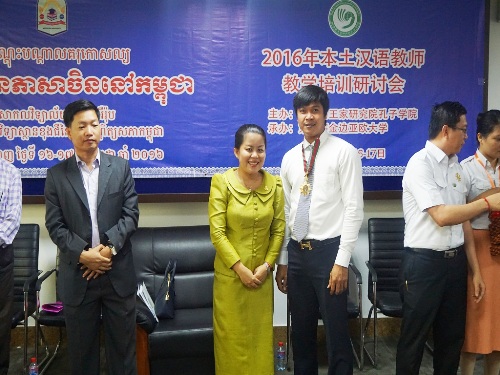 7月16-17日,柬埔寨王家研究院孔子学院主办的“2016年本土汉语教师培训暨汉语教学研讨会”在金边亚欧大学和暹粒省吴哥高中两地分别举行。2016年汉语桥中文比赛指导教师代表、本土教师学员、孔子学院教师及志愿者、亚欧大学中文系学生100余人参加了活动。柬埔寨教育青年体育部副国务秘书昆娜拉 (H. E. KHUN Rachna),孔子学院院长谢莫尼勒阁下、中方院长帅式毅及亚欧大学副校长舒本苏(SOUR Bunsou)等出席了17日亚欧大学的结业典礼。