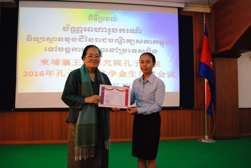 8月5日下午,柬埔寨王家研究院孔子学院在王家研究院礼堂召开2016年孔子学院奖学金生行前会议。柬埔寨王家研究院院长、孔子学院理事长克洛媞达院士(Academician KHLOT Thyda)出席会议,孔子学院院长谢莫尼勒阁下(H.E.CHEA Munyrith)主持会议。