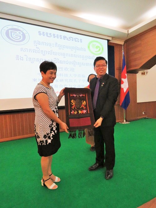 克洛媞达院士与谢莫尼勒阁下向来自中国广西科技大学的五位学者表示热烈的欢迎。克洛媞达院士向广西科技大学代表表达了促进中柬双方文化交流的合作诚意,并向所有为中柬文化交流工作作出巨大贡献的学者、老师表示崇高的敬意。