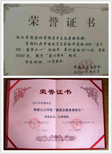 近年来,会计学院团委在思想引领、组织建设、社会实践、志愿服务等方面锐意进取、扎实推进,取得了一定的工作成效:先后获得了江西省暑期三下乡社会实践“先进服务队”称号;连续多年获得九江学院“五四红旗基层团委”称号;先后被中国扶贫基金会授予“爱心团体”称号,多次被九江学院授予“优秀志愿服务队”、“最美志愿者服务队”荣誉称号;多次获九江学院各项比赛一等奖。
