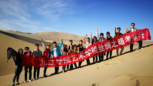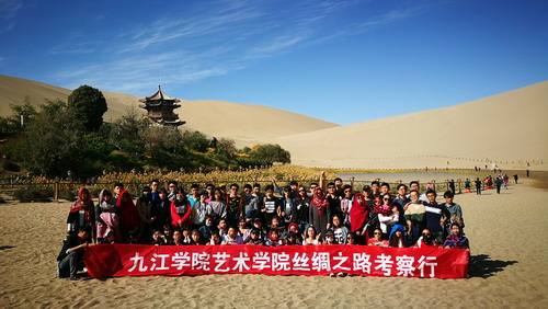 艺术学院师生沿着丝绸之路的大体路线参观、学习。从九江出发到西安—敦煌—嘉峪关—张掖—兰州—九江,在沿途的每一个节点,带队老师均对学生们进行了现场教学。三位老师在沿途针对考察要点进行统一授课,通过对以上地方的建筑、民风、民俗、文化等相关元素做好五个阶段工作:1.收集资料 、2.分析资料 、3.整理资料、4.变形修改、 5.图形应用。从而发现元素、选定元素、元素锤炼、做到课程的元素的形式拓展和设计拓展。