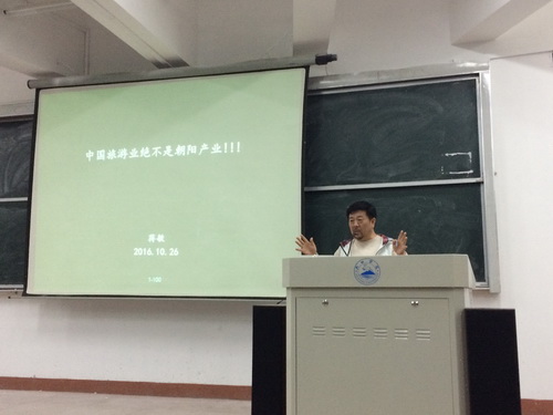 10月30日晚,北京人文大学策划系客座教授,深圳旅游沙龙总干事,深圳市铁汉生态环境股份有限公司首席策划师蒋敏在竞知楼4号阶梯教室,为旅游与国土资源学院师生作了一场题为“中国旅游开发的问题和对策”的精彩报告。报告由院长李松志主持。副院长赵追,旅游学科教师以及2016级旅游专业的全体同学参加了报告会。